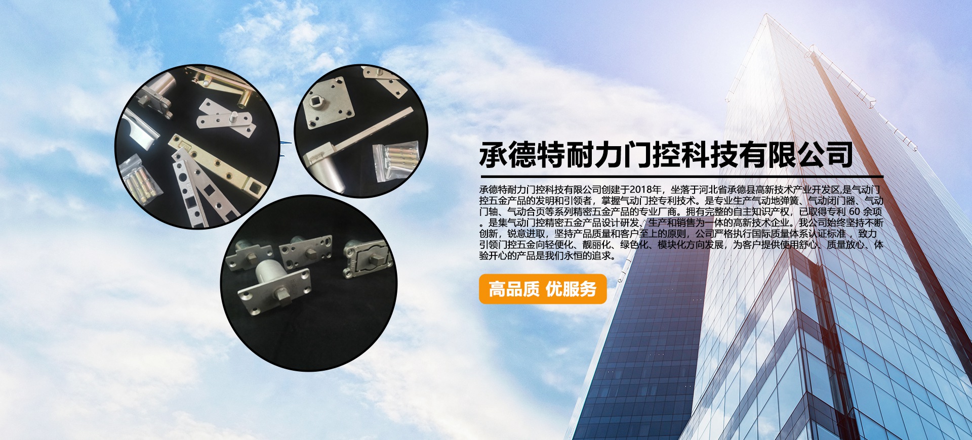 承德特耐力門(mén)控科技有限公司創(chuàng)建于2018年,坐落于河北省承德縣高新技術(shù)產(chǎn)業(yè)開(kāi)發(fā)區(qū),是氣動(dòng)門(mén)控五金產(chǎn)品的發(fā)明和引領(lǐng)者,掌握氣動(dòng)門(mén)控專(zhuān)利技術(shù)。是專(zhuān)業(yè)生產(chǎn)氣動(dòng)地彈簧、氣動(dòng)閉門(mén)器、氣動(dòng)門(mén)軸、氣動(dòng)合頁(yè)等系列精密五金產(chǎn)品的專(zhuān)業(yè)廠(chǎng)商。擁有完整的自主知識(shí)產(chǎn)權(quán),已取得專(zhuān)利 60 余項(xiàng)。是集氣動(dòng)門(mén)控精密五金產(chǎn)品設(shè)計(jì)研發(fā)、生產(chǎn)和銷(xiāo)售為一體的高新技術(shù)企業(yè)。我公司始終堅(jiān)持不斷創(chuàng)新,銳意進(jìn)取,堅(jiān)持產(chǎn)品質(zhì)量和客戶(hù)至上的原則,公司嚴(yán)格執(zhí)行國(guó)際質(zhì)量體系認(rèn)證標(biāo)準(zhǔn) ,致力引領(lǐng)門(mén)控五金向輕便化、靚麗化、綠色化、模塊化方向發(fā)展,為客戶(hù)提供使用舒心、質(zhì)量放心、體驗(yàn)開(kāi)心的產(chǎn)品是我們永恒的追求。